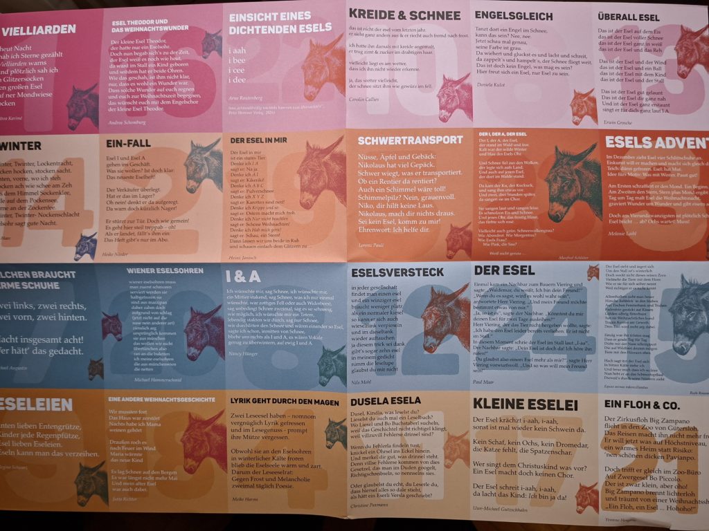 auf dem Plakat mit 24 Eselsohr-Gedichten der Fachzeitschrift für Kinder- und Jugendmedien „Eselsohr“ Hg. v. Christine Paxmann, Chefredaktion: Heike Nieder; 2025/Heft 12